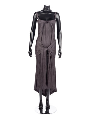 Gray polyester pleated dress with satin ribbon shoulder straps, wrap around ties, and uneven hem line.