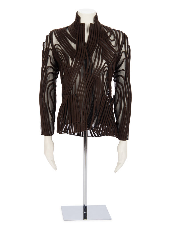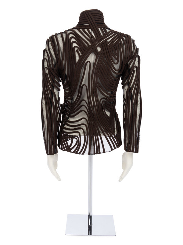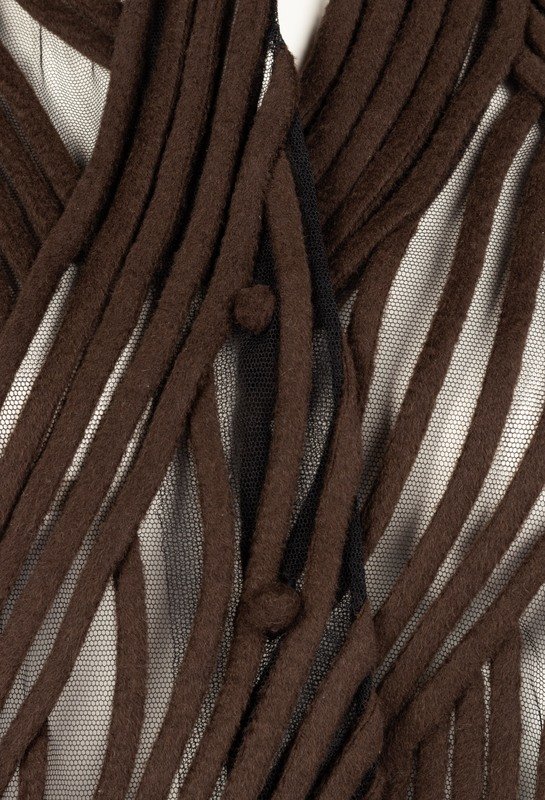 Brown felted cashmere strips on black net fitted jacket with single notch lapel, slim fit sleeves, front patch pockets, and center front felted button closure.