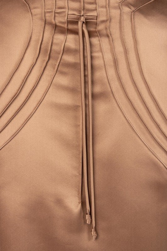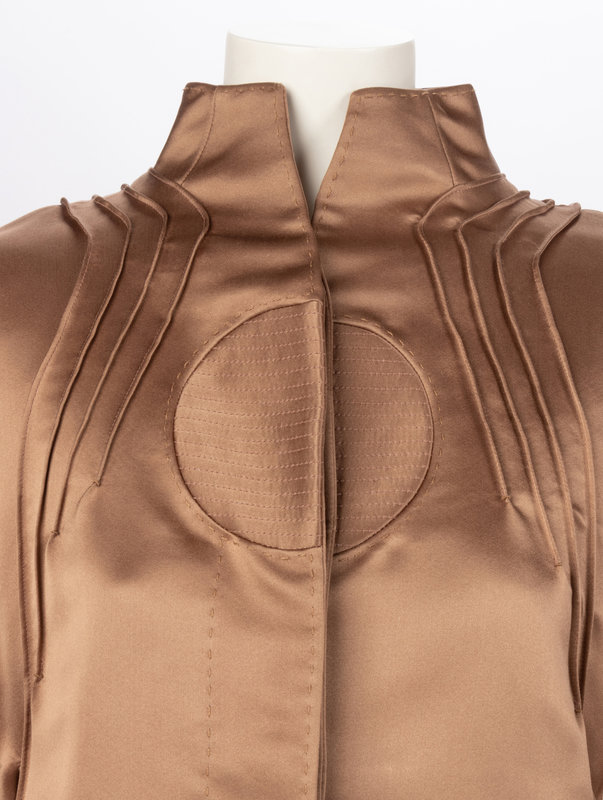 Dark taupe silk satin flared jacket with built-up collar, pin-tuck pleat detail, quilted circle in the center, flared sleeves, and center front hidden button closure.