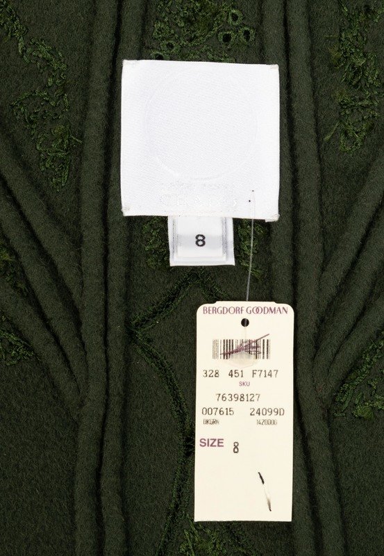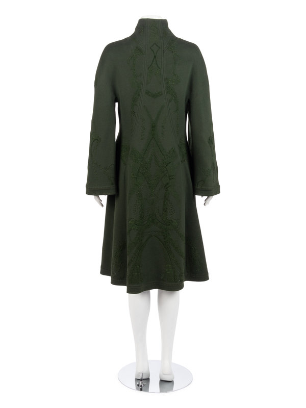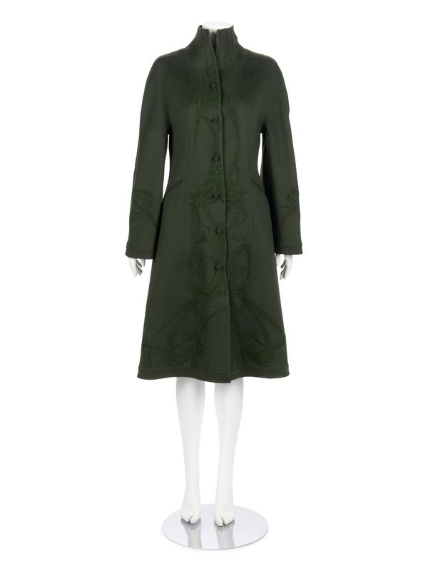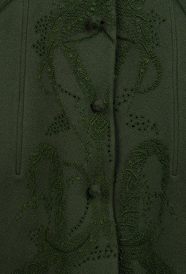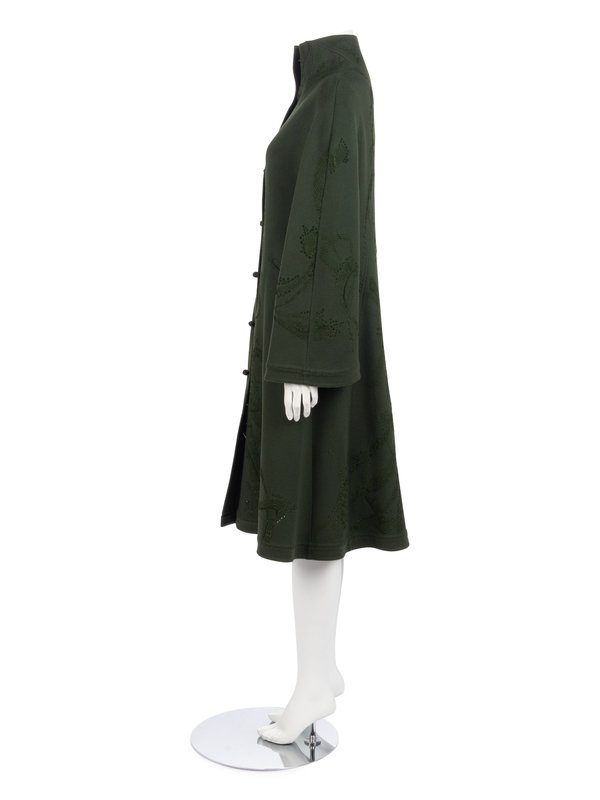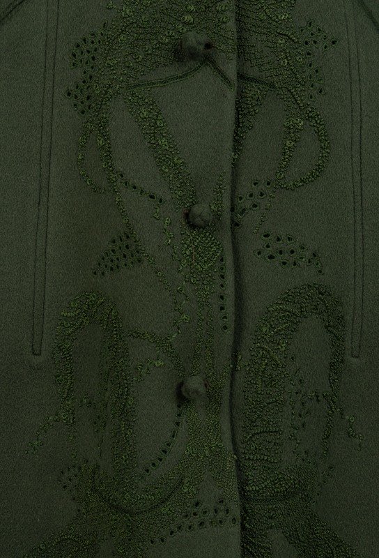 Dark green cashmere coat with matching green embroidery and bound eyelets, stand collar, built-in sleeves, front hip welt pockets, and fabric knot button closure.