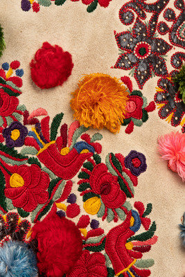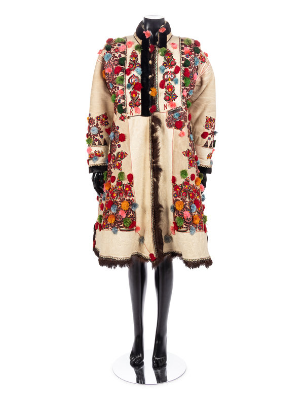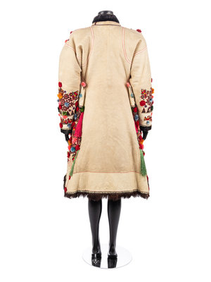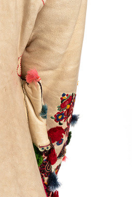 Cream hide with all over multi-hued embroidery, leather appliques, pom poms, and fully trimmed in dark brown fur and embossed leather. The bride's initials and wedding year is monogrammed at front right and the coat is fully lined in white lamb fur.