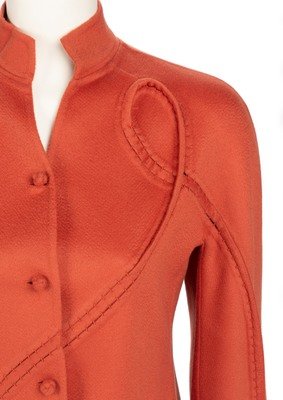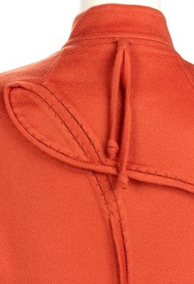 Rust red cashmere jacket with pieced inserts, stand collar, built-in sleeves, and front fabric knot button closure.