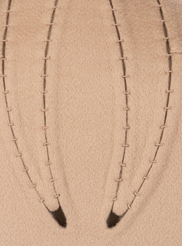 Beige cashmere swing jacket with pieced inserts, funnel collar, and built-in sleeves.