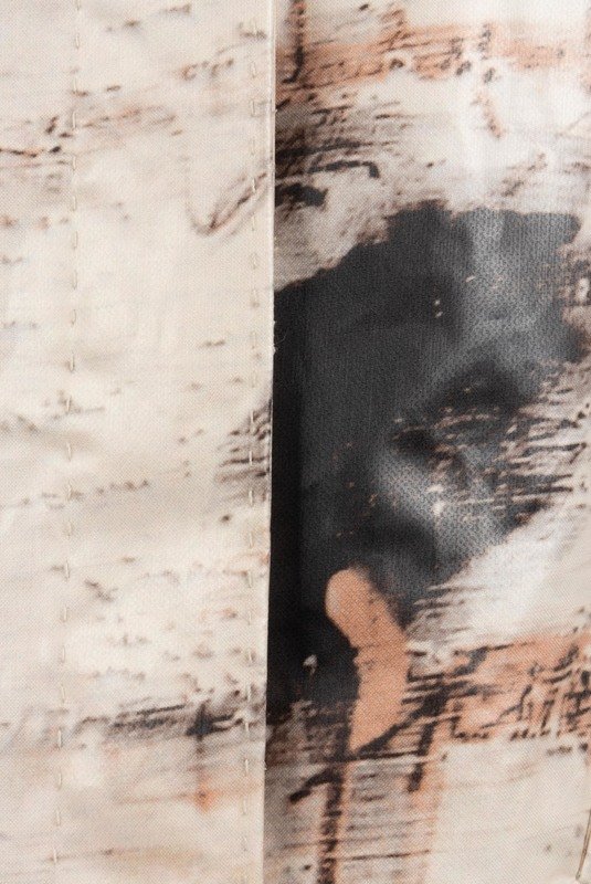 White plastic coat with digital graffiti print, stand collar, flared bell sleeves, front hip welt pockets, and hidden front button closure.