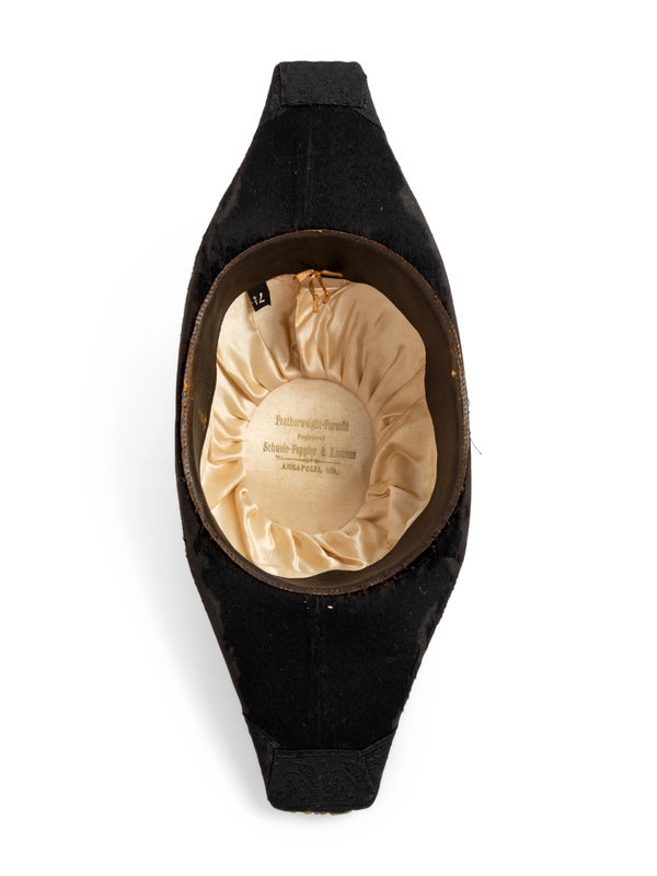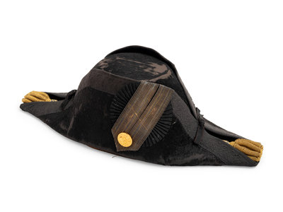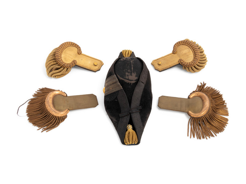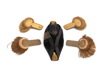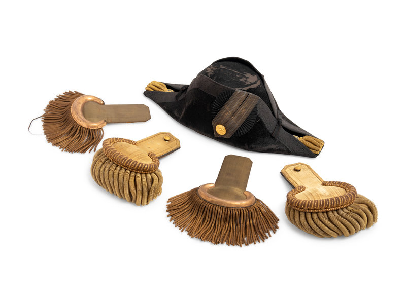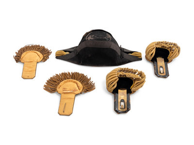 Beaver fur dress bicorn hat with bullion braided acorn on each end, black faille rosette with gold braid and button on the front right. Two sets of epaulets; one set with matching braid to the hat; one set appears older, set with metal crescents, and with finer braid. Hat and Epaulets come in custom black metal box.