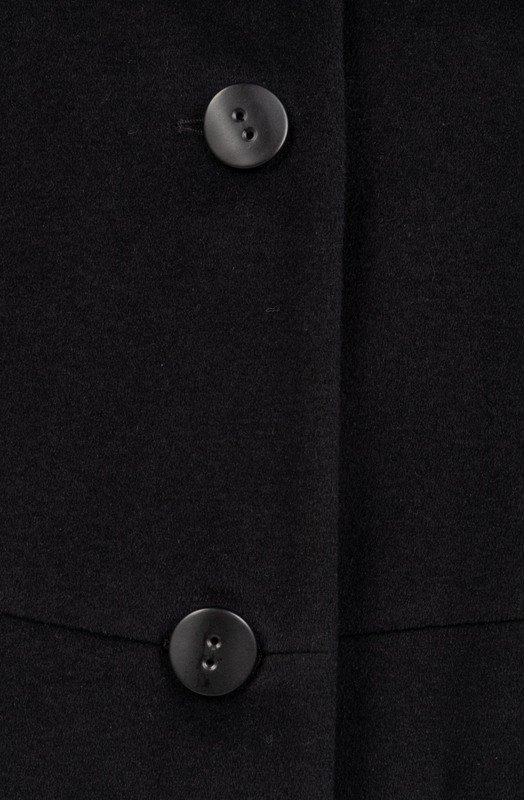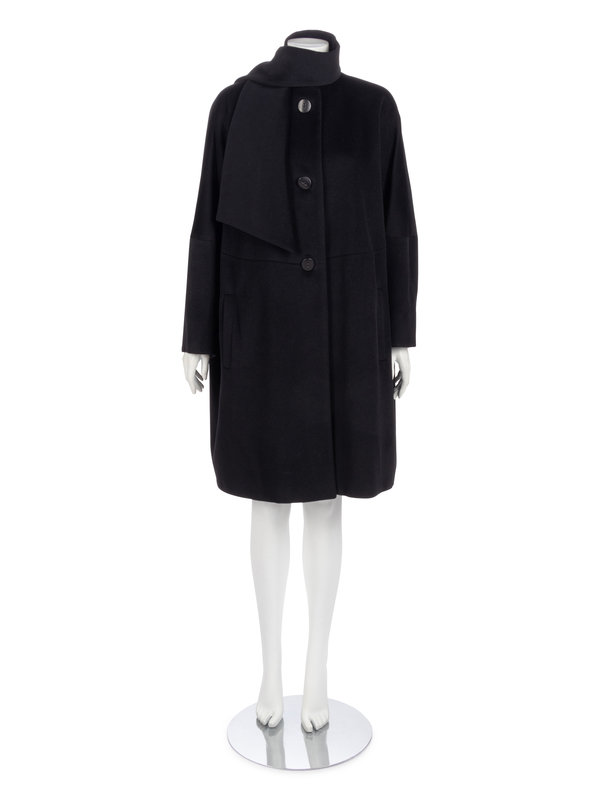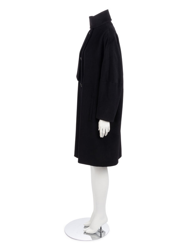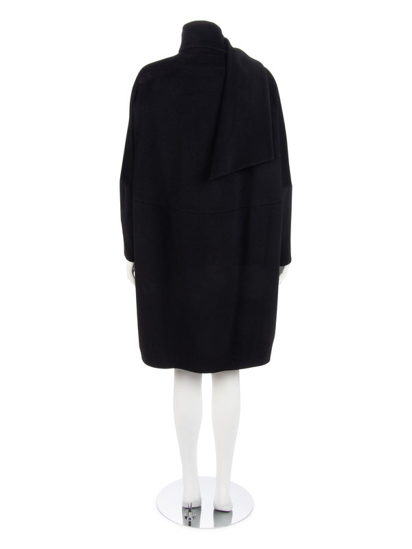 Black cashmere over-sized coat with built in dolman sleeves, front hip welt pockets, and center front three button closure; paired with matching pointed neck scarf.