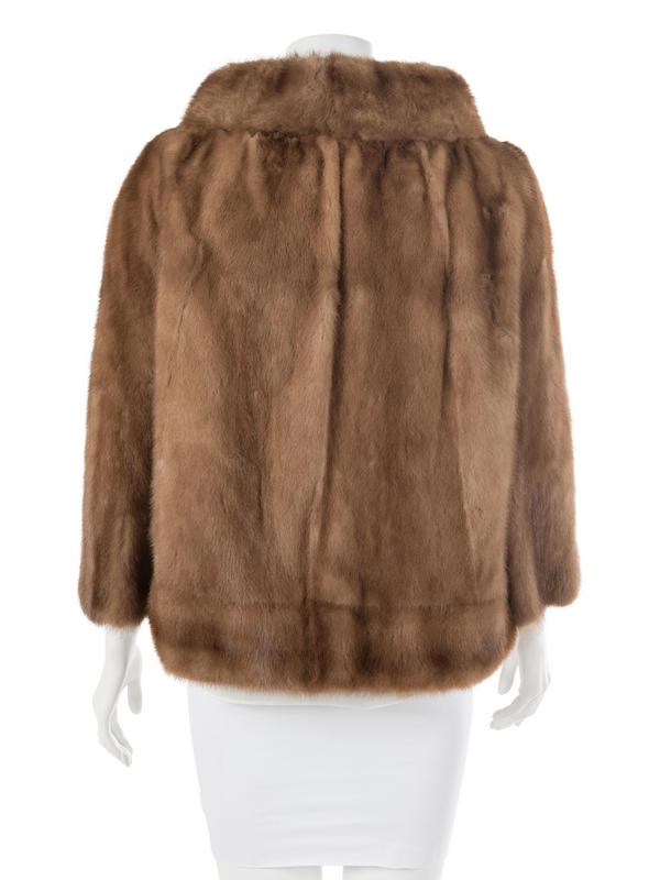 Light brown mink coat with wide stand collar, 3/4 length sleeves, slip pockets over each hip and a single button at the neckline.