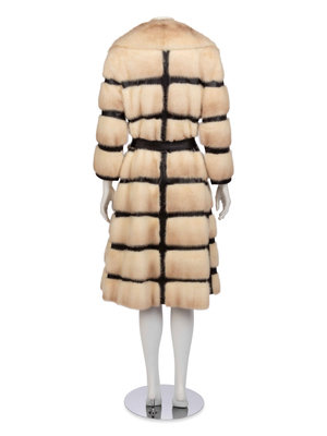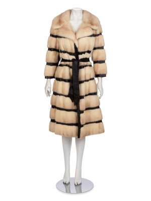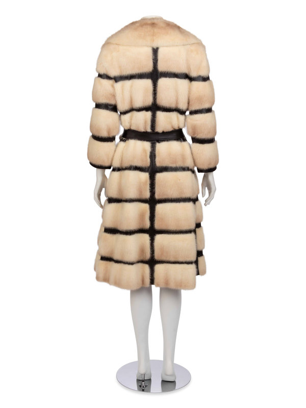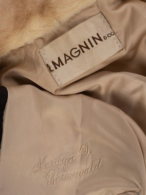 Off-white mink fur and dark brown leather coat with notched lapel, tie belt, and front hook and eye and snap closure. "Marilyn D. Rosenwald" embroidered in the front right lining.