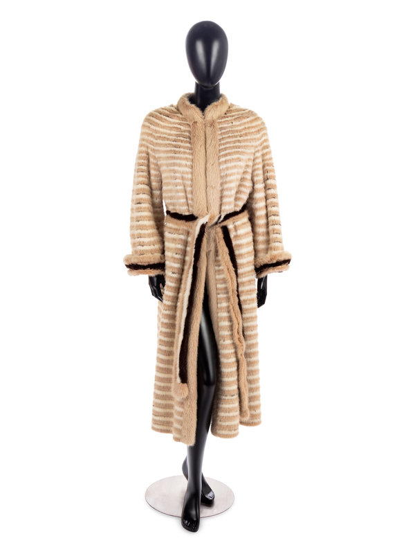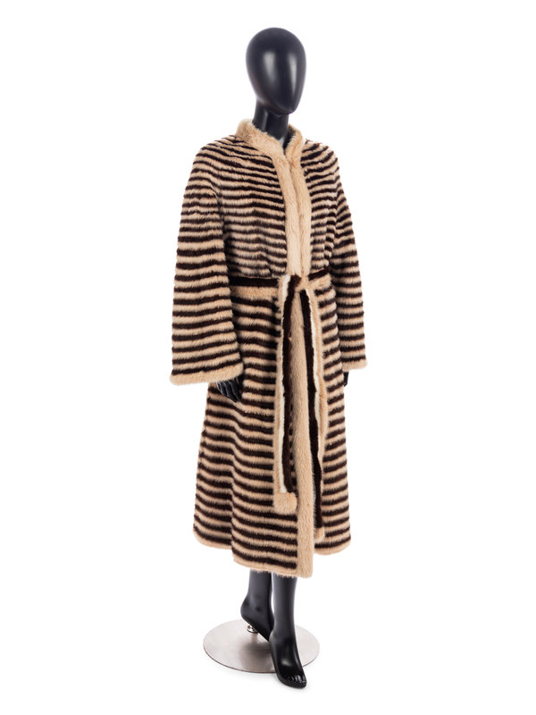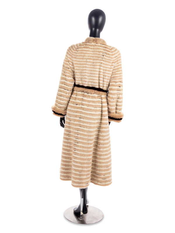Variegated brown striped mink coat with matching tie belt.