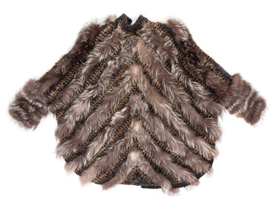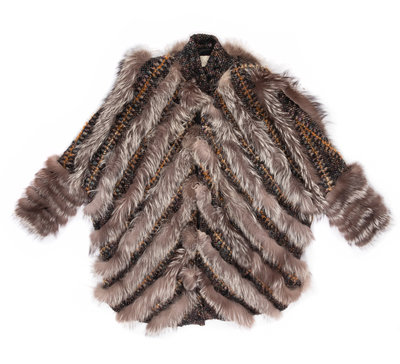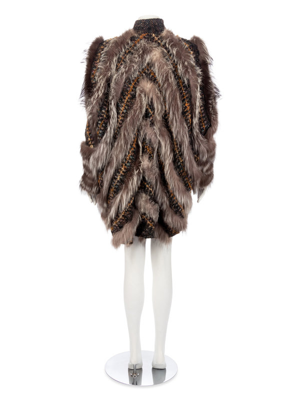 Black with yellow, purple, and blue wool woven jacket trimmed with gray fur, and hook and eye front closure.