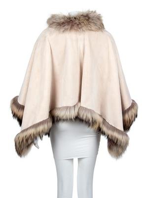 Cream sheared fur cape trimmed in tan and black fox and raccoon fur with cream leather snap closure at neckline and printed plaid lining.