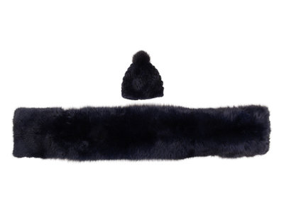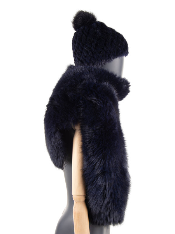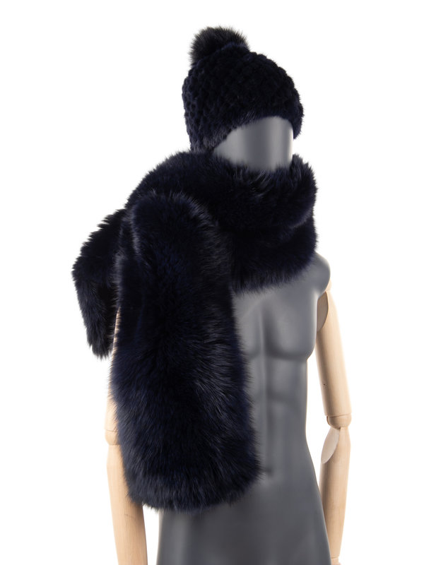 Dark blue fox fur wrap with slit opening; paired with matching dark blue mink on black knit beanie hat with fox fur pouf.