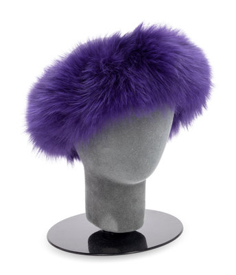 Purple fox fur headband lined with black velveteen and Velcro closure.