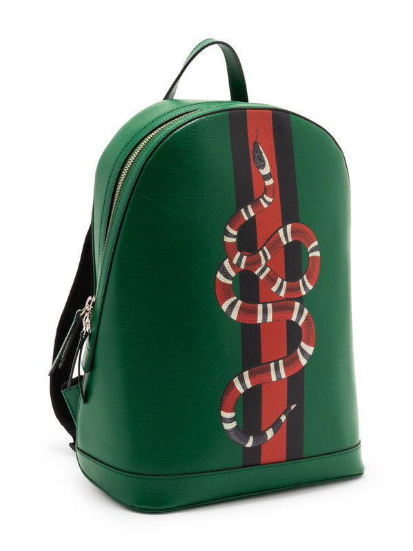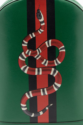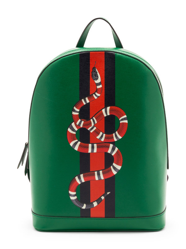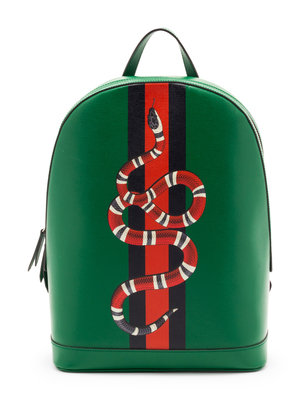 Gucci's Kingsnake print, designed by Alessandro Michele, is featured on the front of this limited edition green leather backpack shown as part of the Autumn Winter Precollection 2017.