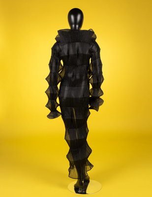 Black polyester sheer pleated maxi length evening dress with funnel neck and long sleeves. Spring/Summer 1994
