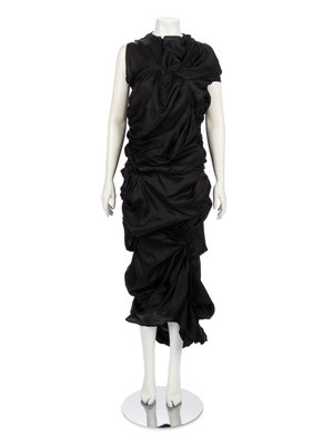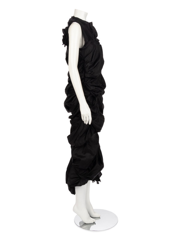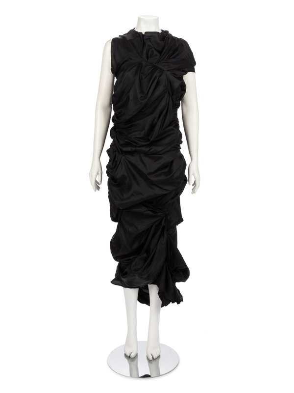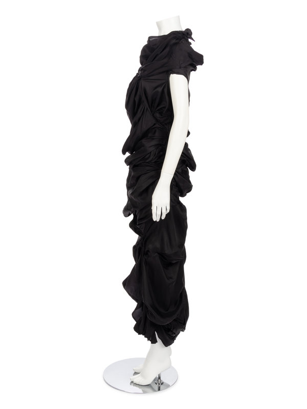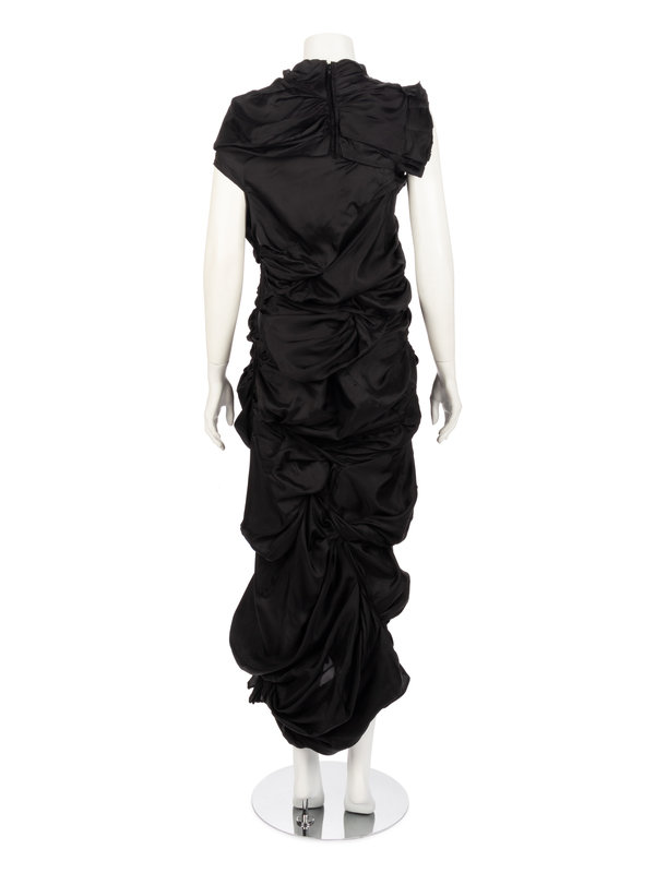 Black cupro asymmetrically draped and shirred sleeveless evening dress with left and back neck zipper closures.