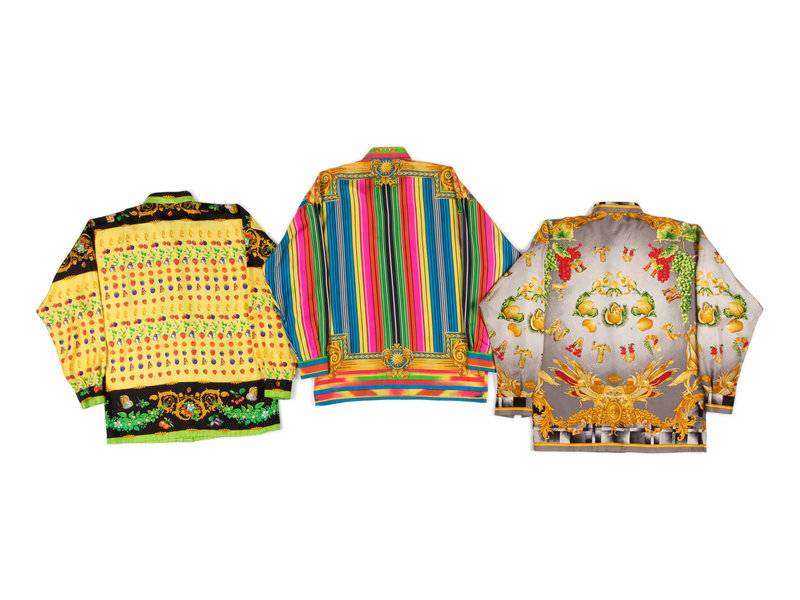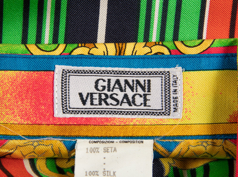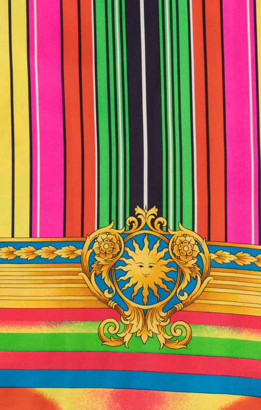 Neon colored stripe silk shirt with golden yellow foliage print.