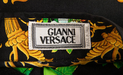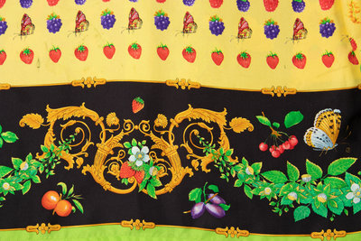 Black and yellow print silk shirt with butterflies and fruit motif.