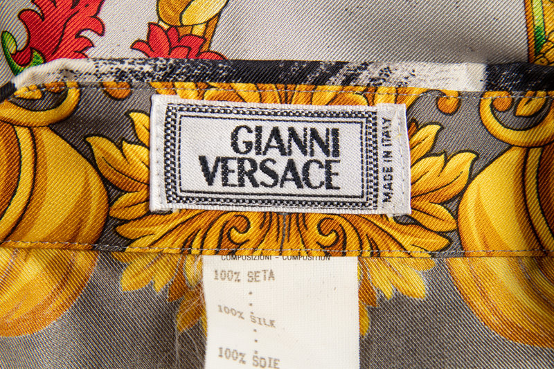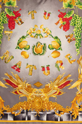 Ombre grey silk "Autumn Nature" print shirt with corn, grapes, and figs print.