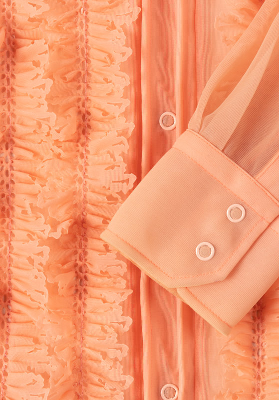 Peach polyamide sheer dress shirt with die-cut ruffled front.