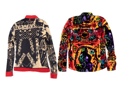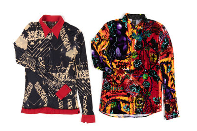 Bright multi-hued print velveteen shirt with Spanish-inspired graffiti.
