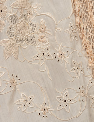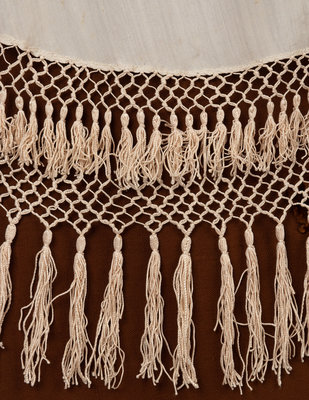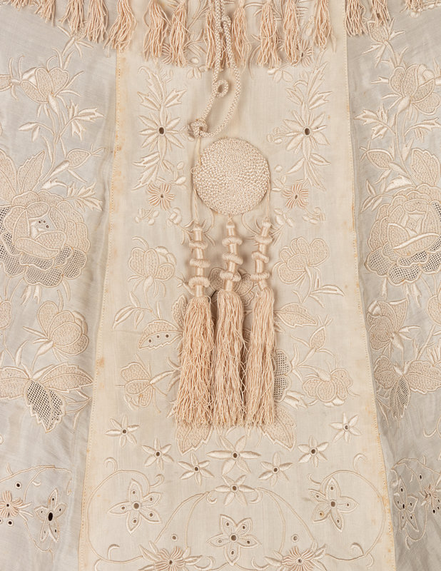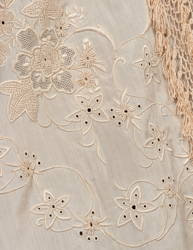 White silk embroidered capelet with braided fringe and tassels; paired with a matching scarf.