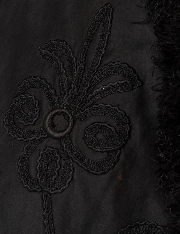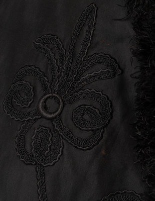 Black embellished cape with floral soutache detailing and black ostrich feathers on collar and hemline.