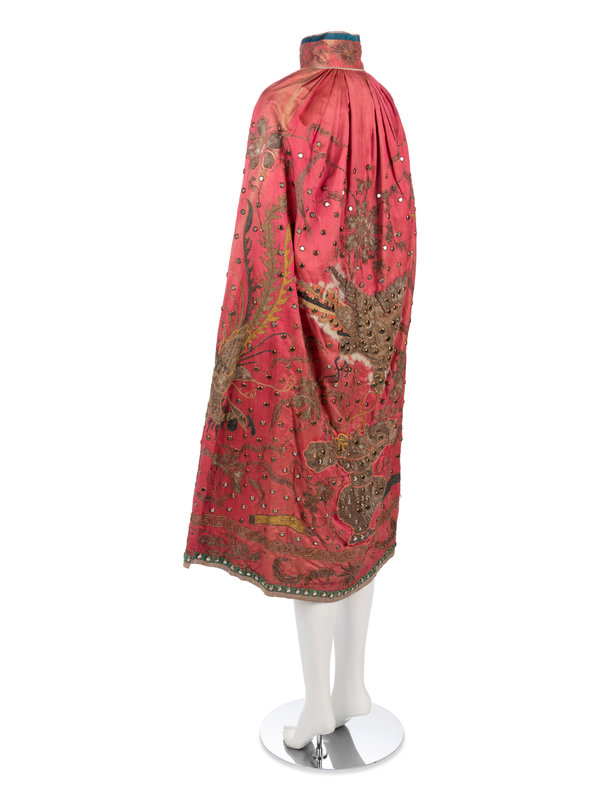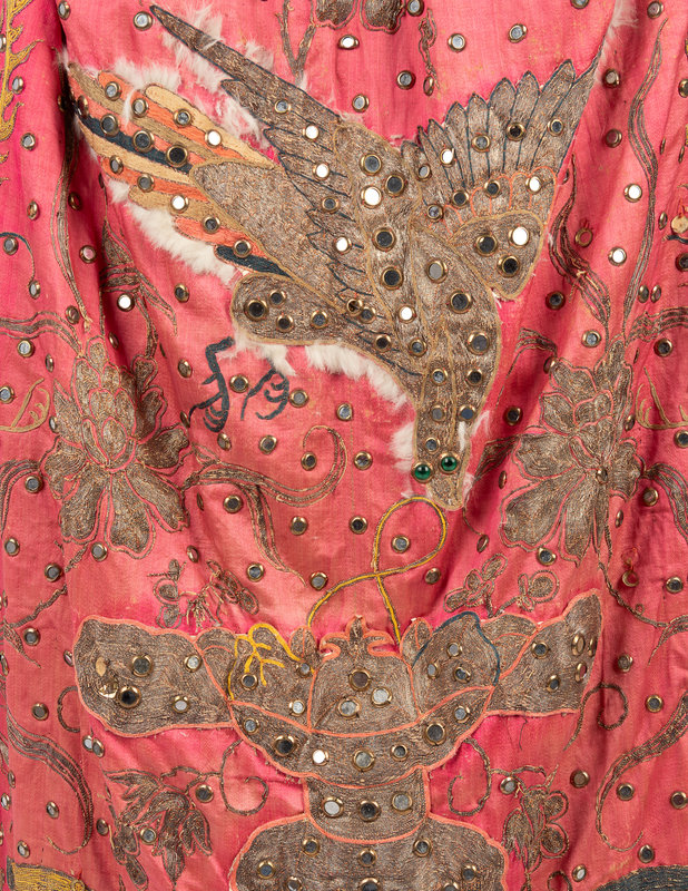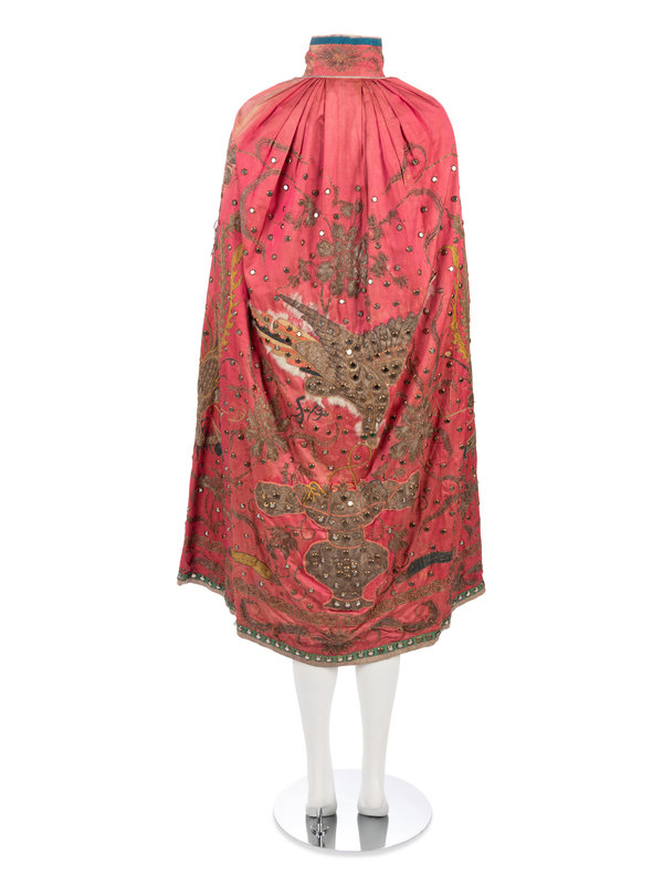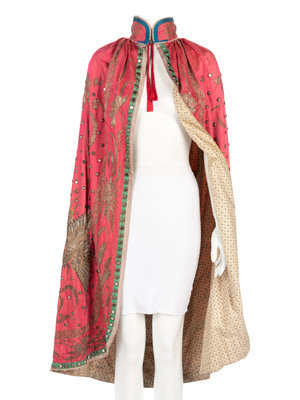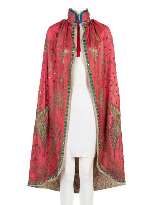 Pink satin cape trimmed with blue, green, and gray satin and embellished with brass mounted mirrors and silver threaded Greek key, floral, and bird motifs, lined in white cotton with blue floral print.