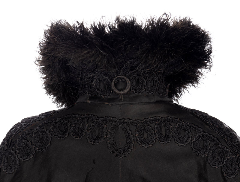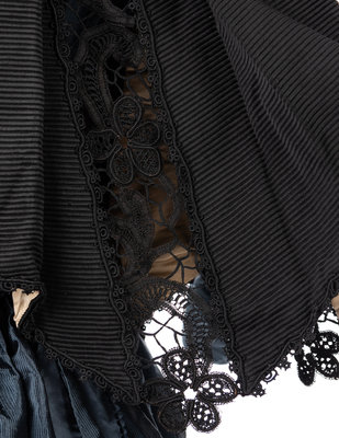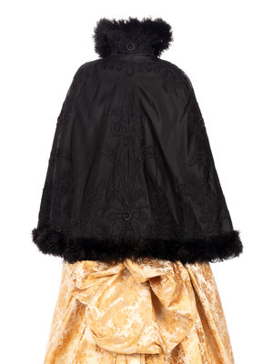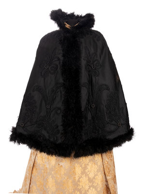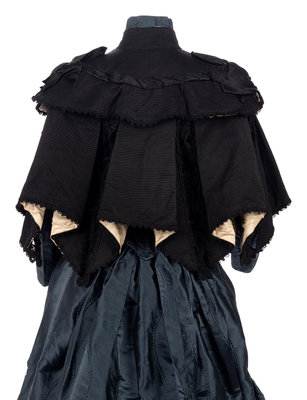 Black ottoman flounced cape with black lace inserts and trimmed in black satin ribbon, lined in white satin with center front hook and eye closures.