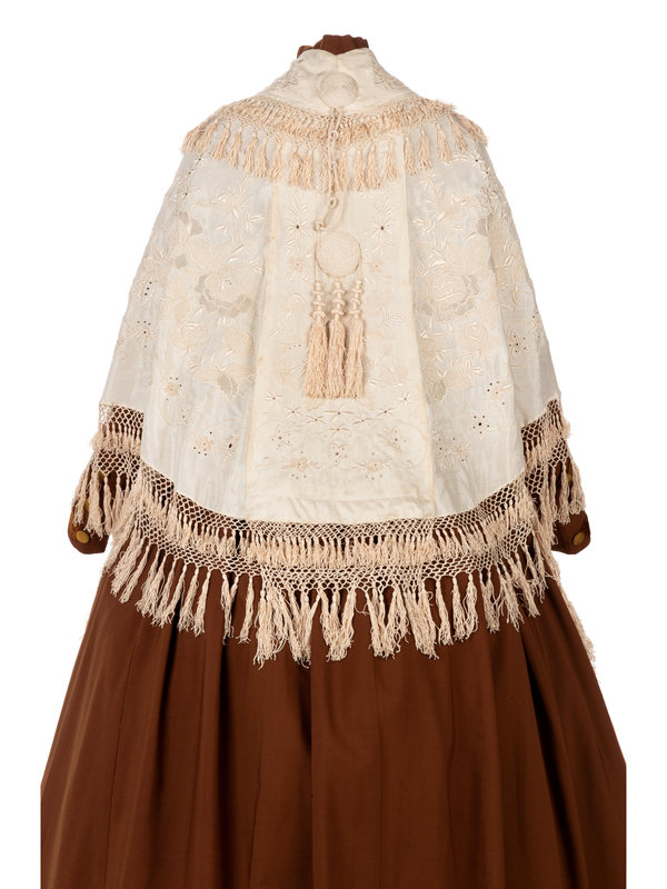 This lot includes seven historical pieces: Two-piece dress, black cape with feathers, white cape with separate scarf, red cape, black cape with white lining. *The brown dress under the white cape is available in Lot 66.
