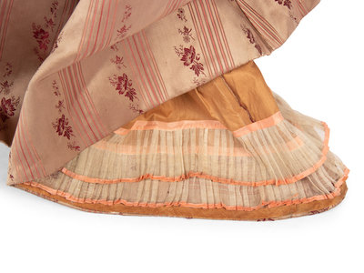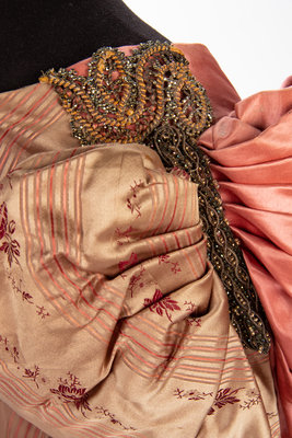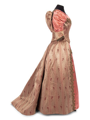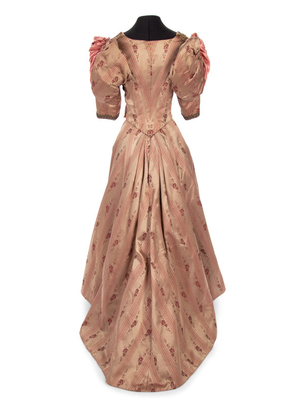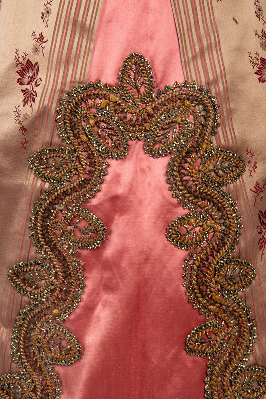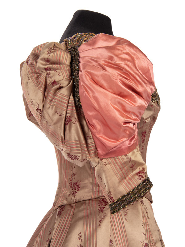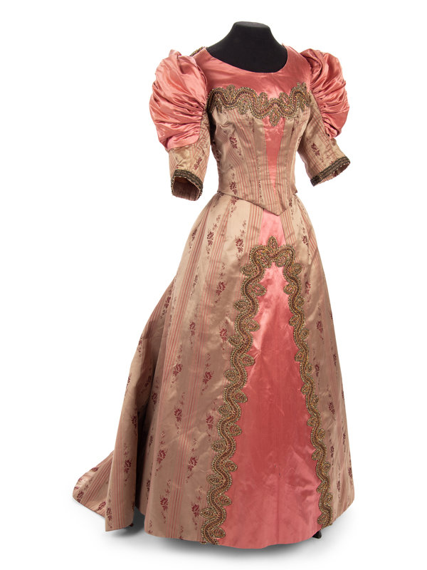 Two piece evening dress in pink and taupe striped silk satin jacquard with pink silk satin puff sleeves, bodice, and skirt panels, embellished with gold-tone metallic bead appliques on both bodice and skirt.