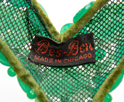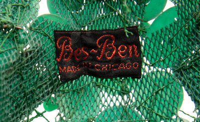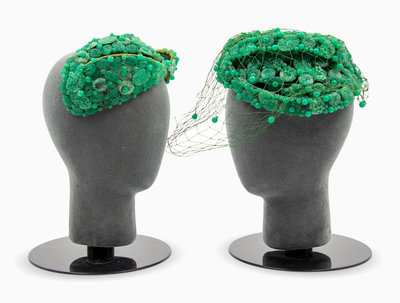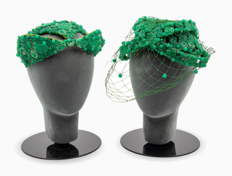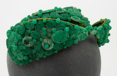 Large green Peking glass ornamented bucket style hat with veil. Three hair combs included.