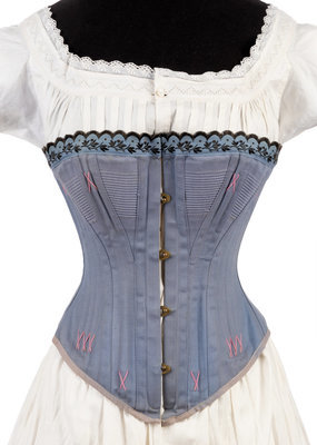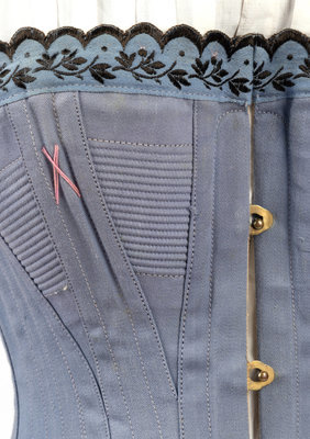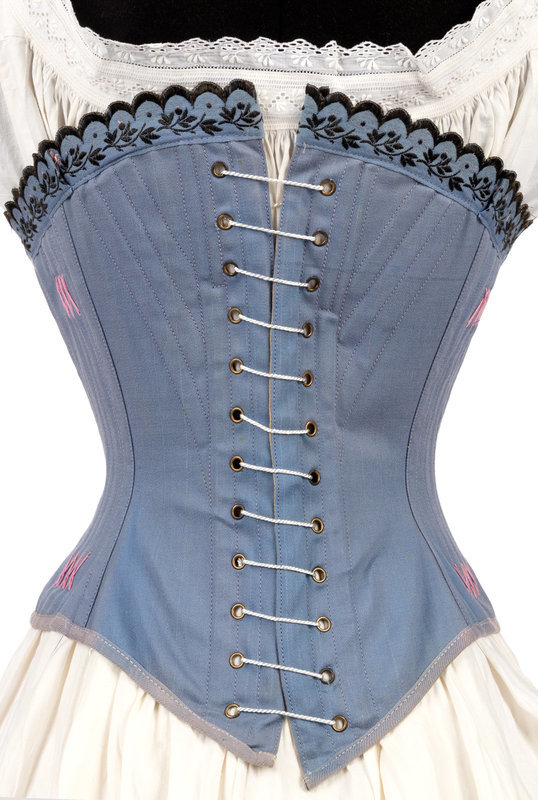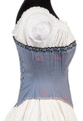 Light blue cotton twill corset edged with floral patterned trim, pink reinforcement decorative stitching, front metal post and loop closure, and lace up back, but no lacings.