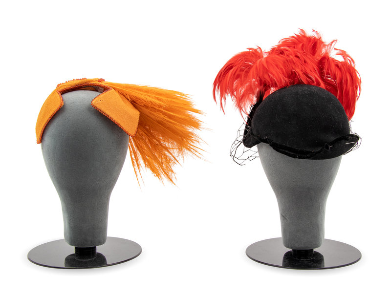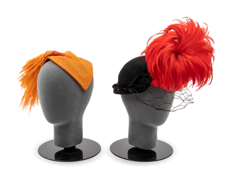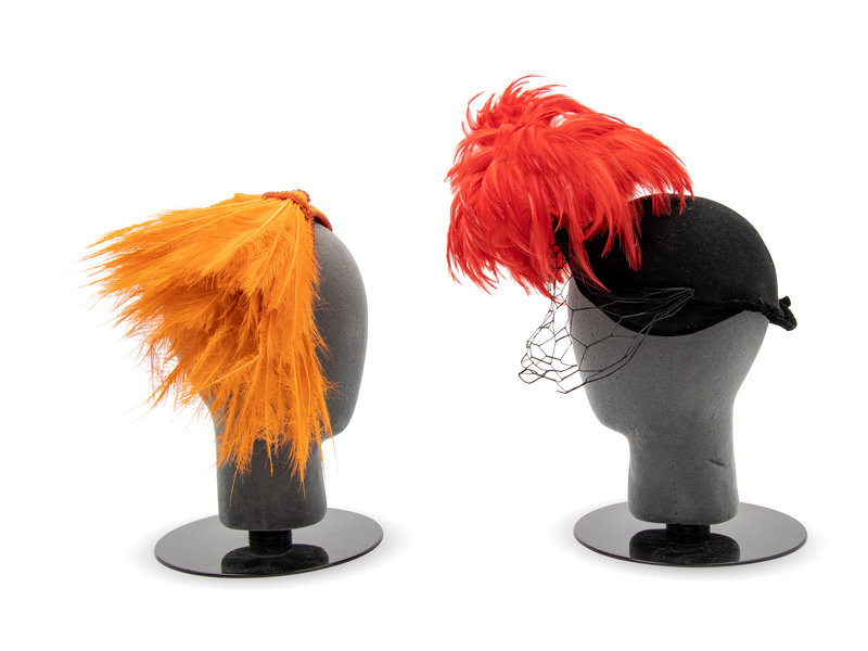 Two Bes-Ben Hats with Feathers; One Red, One Orange, 1940s-1950s