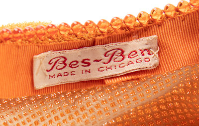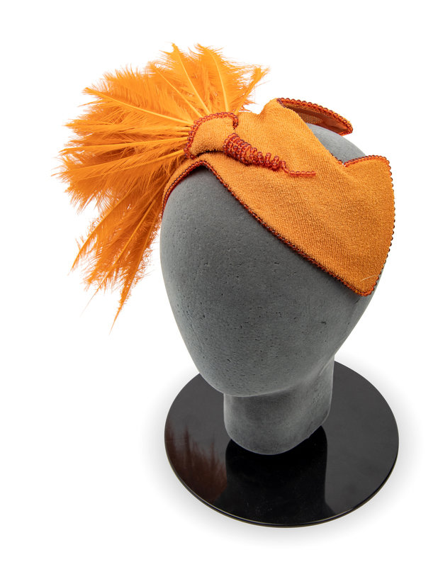 Orange looped fabric covered hat with side feather detail and trimmed in orange plastic beading.