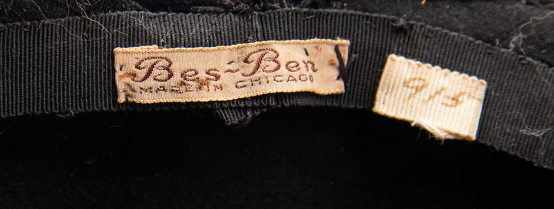 Black felt cap with red stripped coque feathers in front, edged in black velvet trim, and black net veil. Two hat pins included.