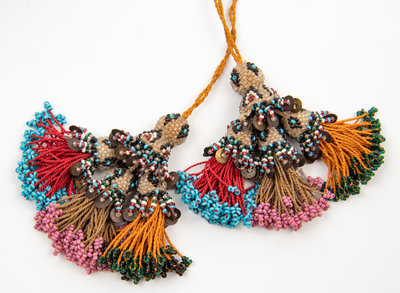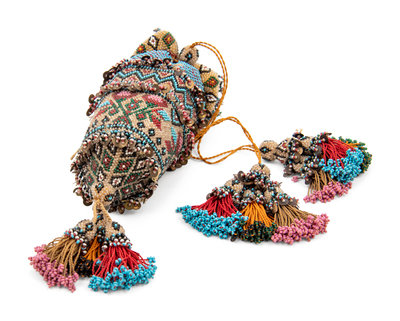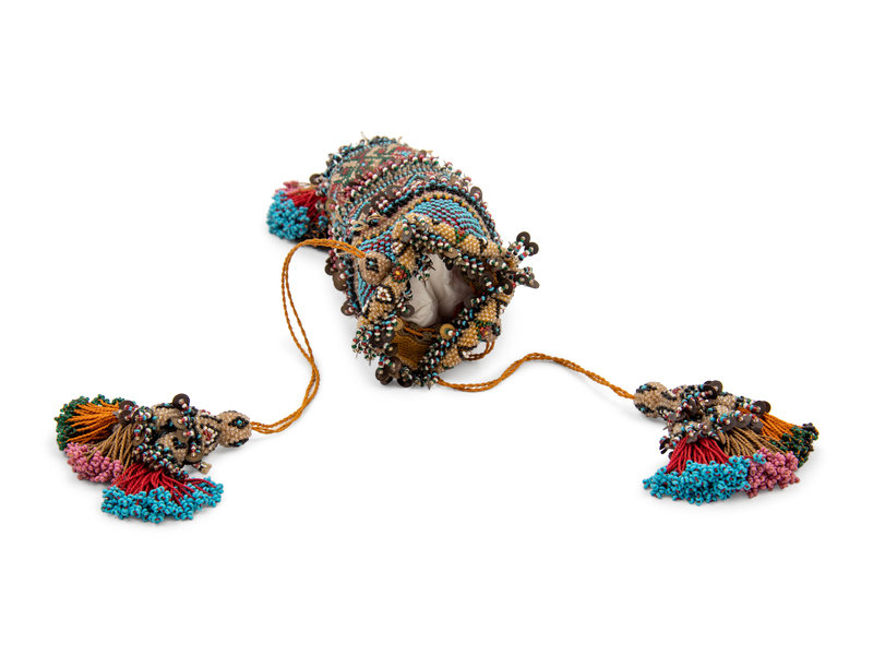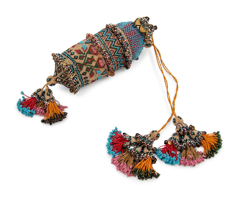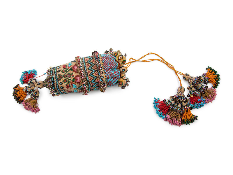 Multi-hued floral and geometric patterned glass seed bead drawstring cylindrical reticule with tassels.