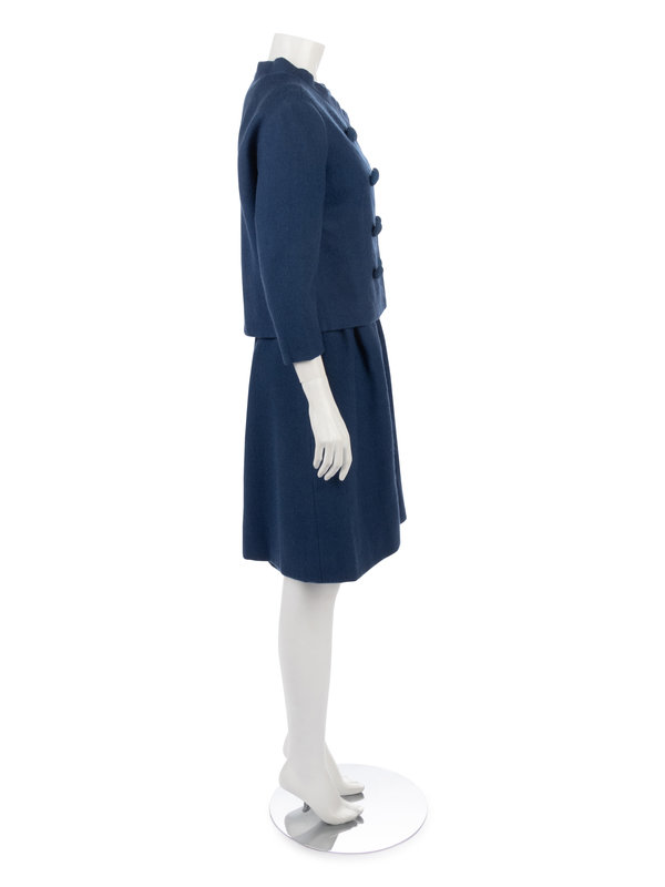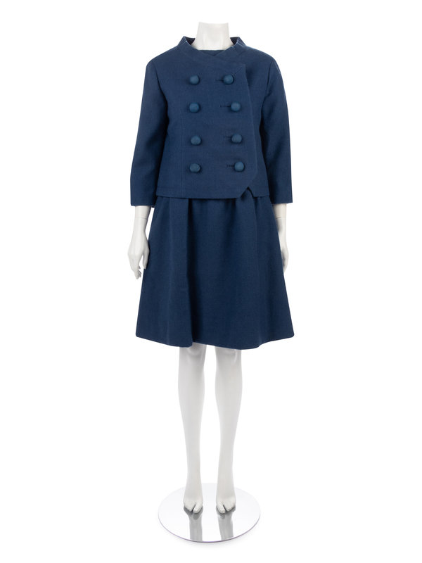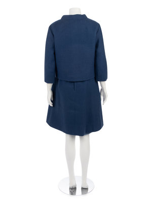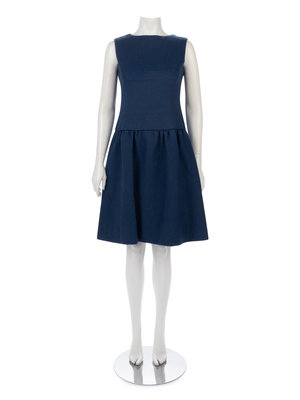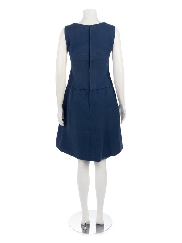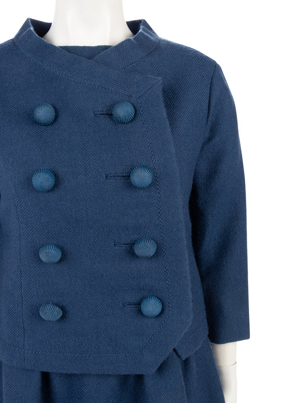 Blue wool twill sleeveless dropped waist dress with fitted bodice and gathered circular skirt; paired with matching double breast box cut jacket