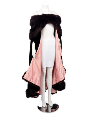 Black silk velvet cape with black/brown fox fur trimmed collar and hemline, arm holes, and lined in pink satin.