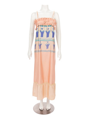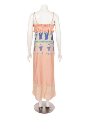Peach pink bias-cut spaghetti strap evening dress with blue flora print and matching pleated kimono-style robe with front tie closures.