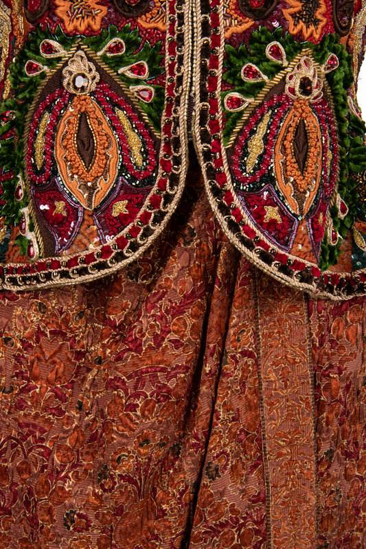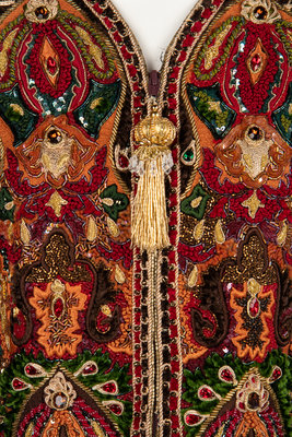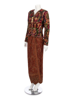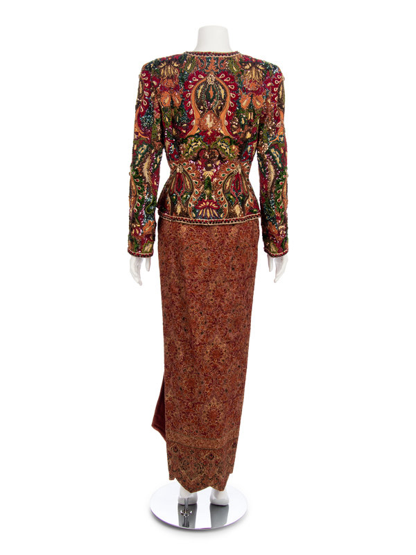 Heavily embellished burgundy fitted jacket with silk thread and chenille yarn embroidery, sequins, rhinestones, and beading, with zip front closure with beaded tassel pull; paired with floral tapestry wrap skirt.