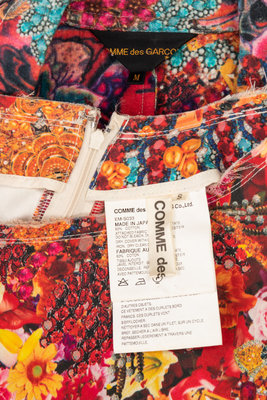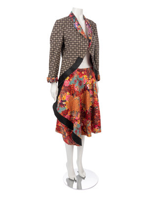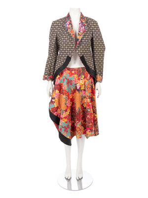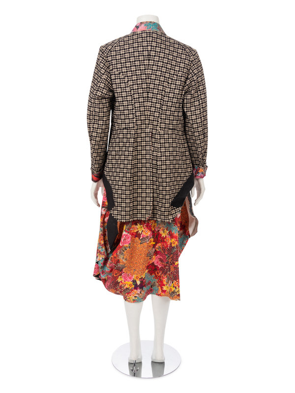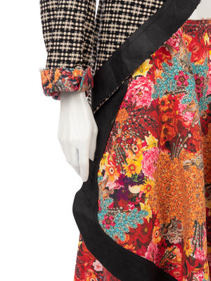 Black and white cotton modified woven plaid waist jacket lined with multi-hued graphic print cotton and trimmed with black non-woven stabilizer; paired with matching printed bubble shaped skirt.