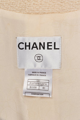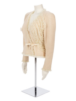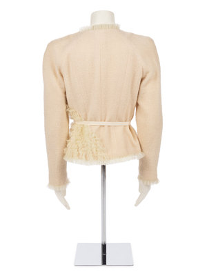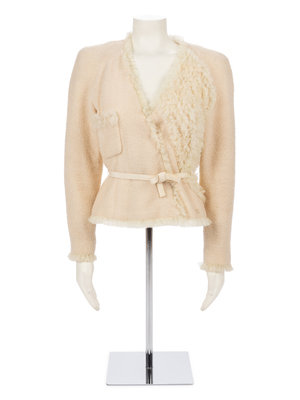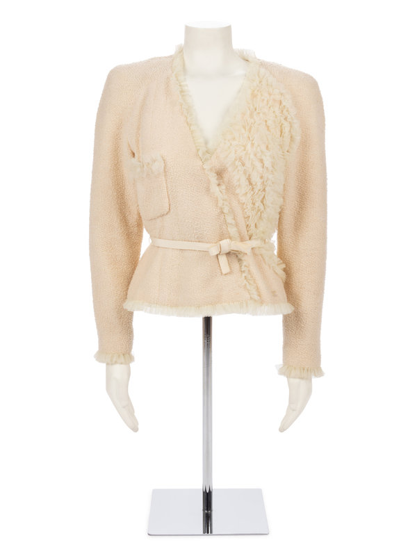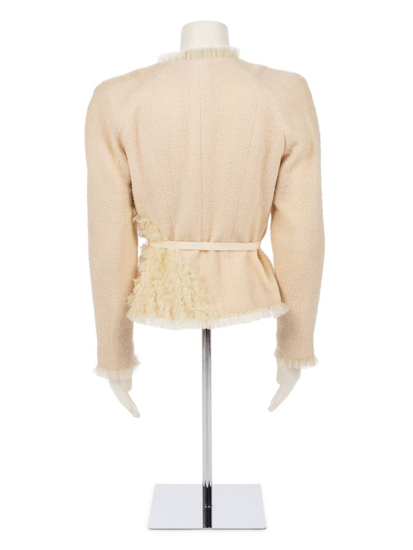 Cream wool/silk blend bouclé wrap jacket with nylon net ruffled trim along the neckline to the back hemline and sleeve hems, cream grosgrain ribbon belt, and asymmetrical clear plastic snap closures.