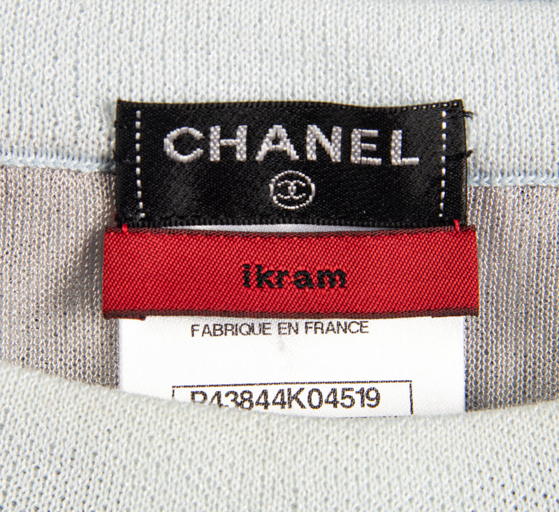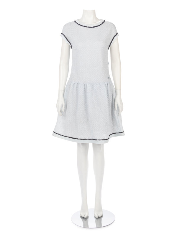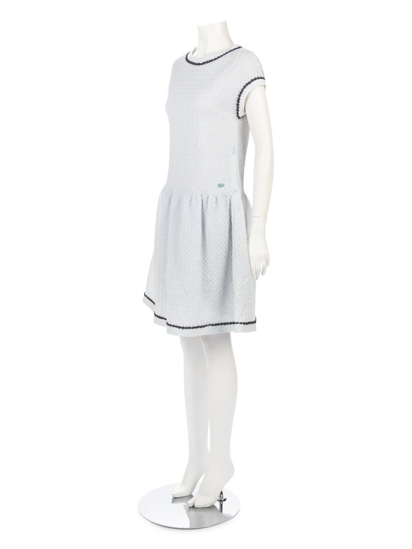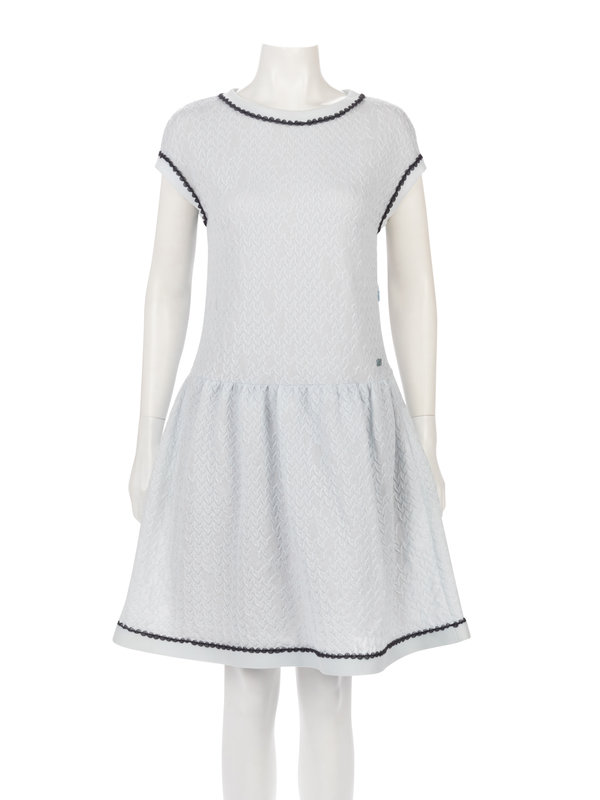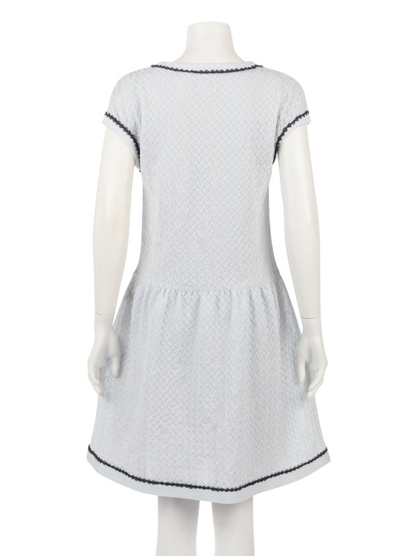 Light blue cotton/poly/nylon blend knit day dress trimmed with black organza, drop shoulder cap sleeves, dropped waist short gathered skirt, and left side zipper closure.