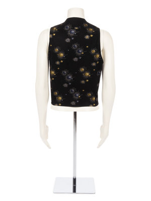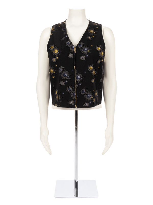 Black knit vest with blue and yellow swirl pattern and front zip closure.