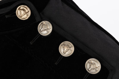 Black velveteen men's jacket with matte silver-tone bull head stamped buttons.