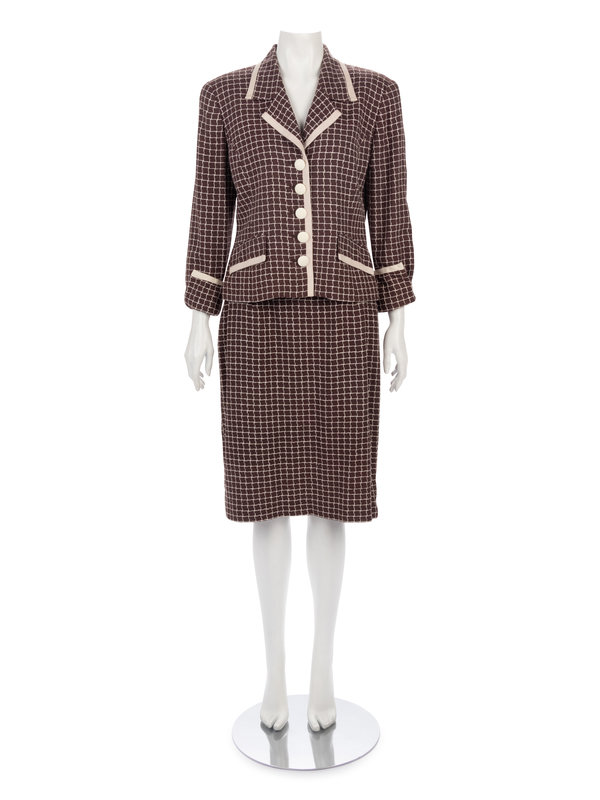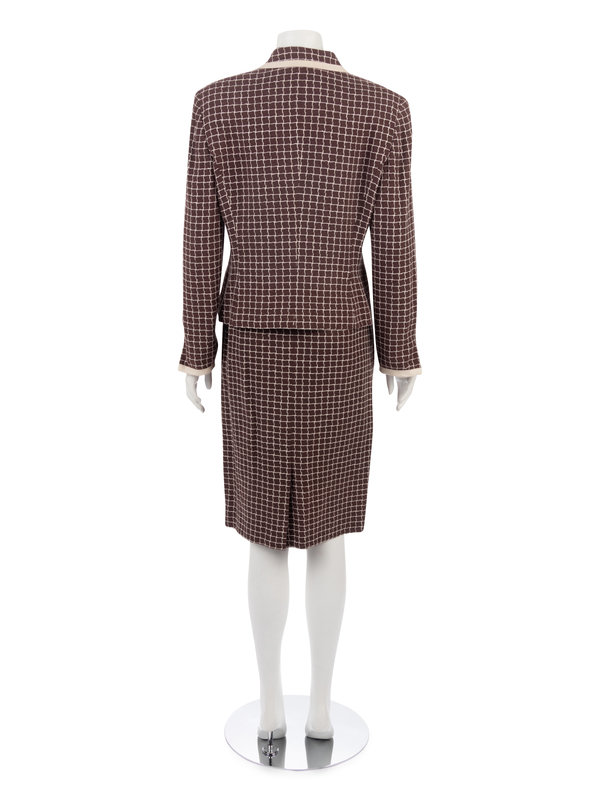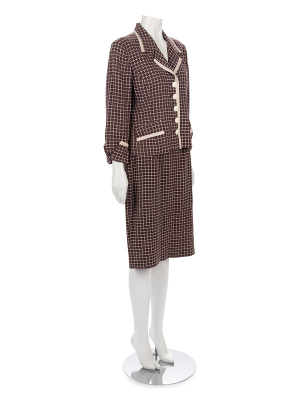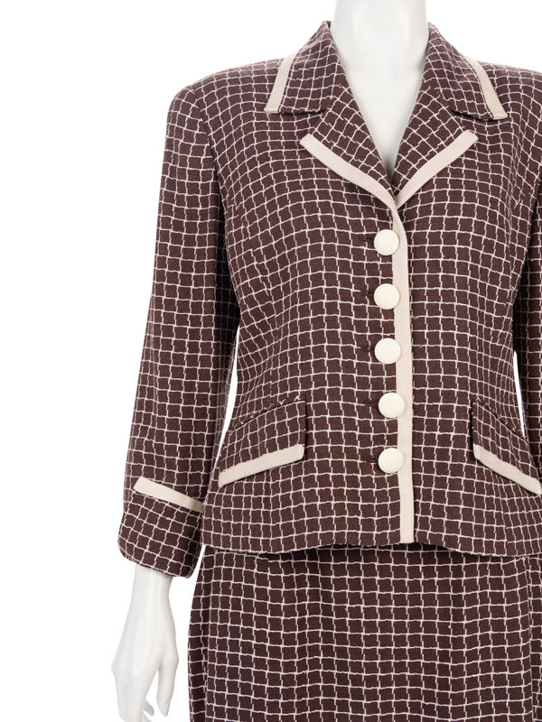 Brown and white silk jacket trimmed in white woven braid, single notch lapel and front button closure; paired with matching pencil skirt with inset seam pockets.