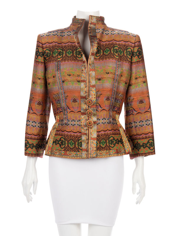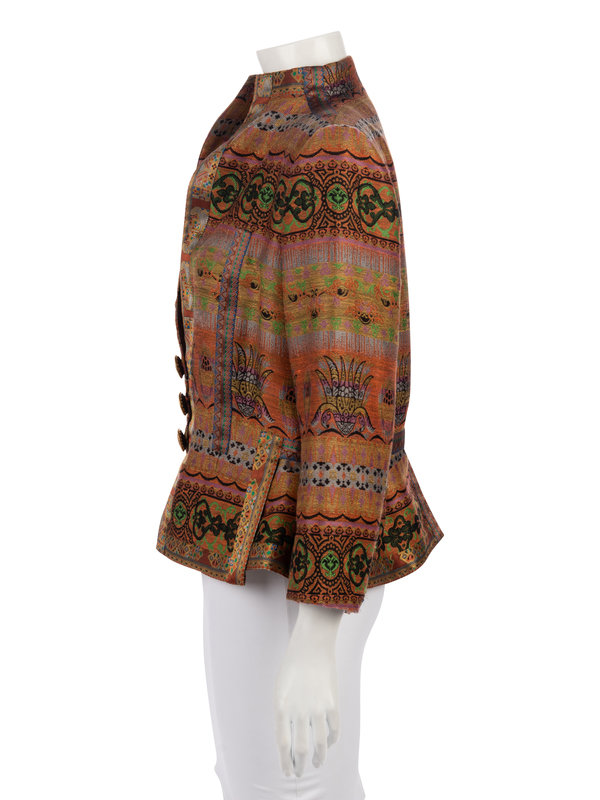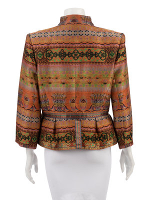 Multi-hued tapestry jacquard jacket in orange, yellow, and lime green, flounced hemline, and three ornate button and loop closures.