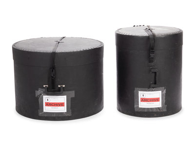 Two black plastic cylindrical hat storage and travel cases with black braided straps and plastic clasps. Boxes 8 and 9.
