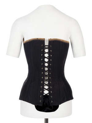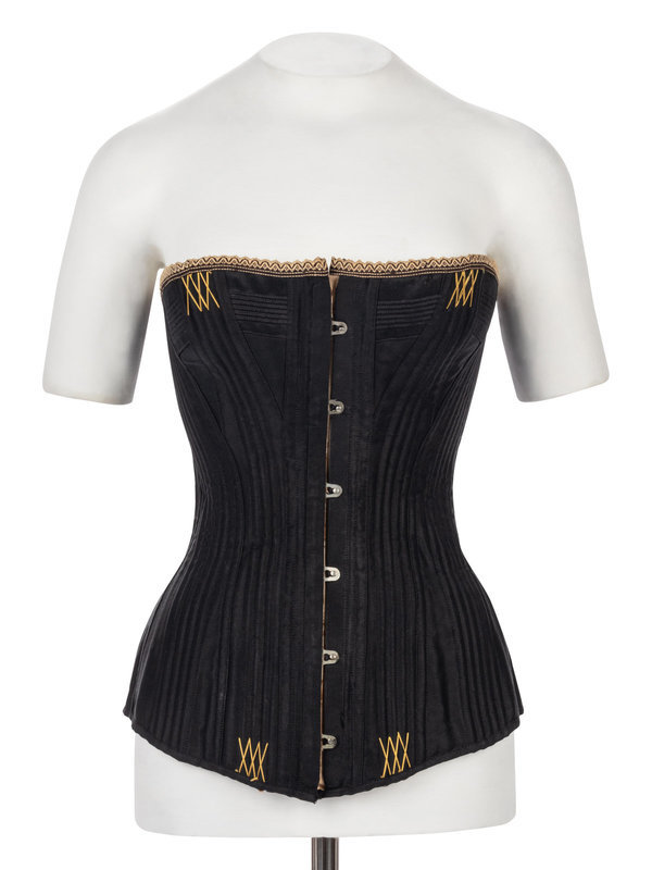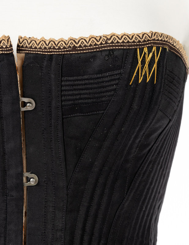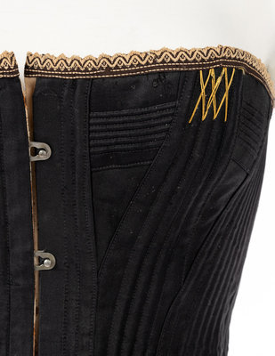 Black silk satin corset with yellow embroidered trim on top edge and decorative yellow thread stay stitching, front post and loop closure, and back lace up. Laces are included, though likely not original.